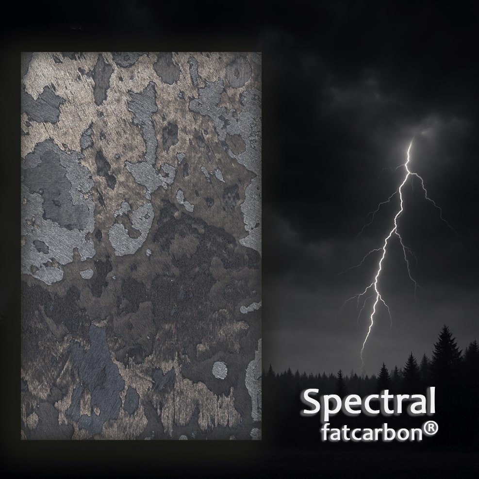 Carbon Fiber Spectral by fatcarbon® is a high-quality carbon fiber material with a unique look. Its surface combines dark blacks and lighter greys, and the pattern never repeats. When light hits it, the material subtly shimmers, changing depending on the angle.